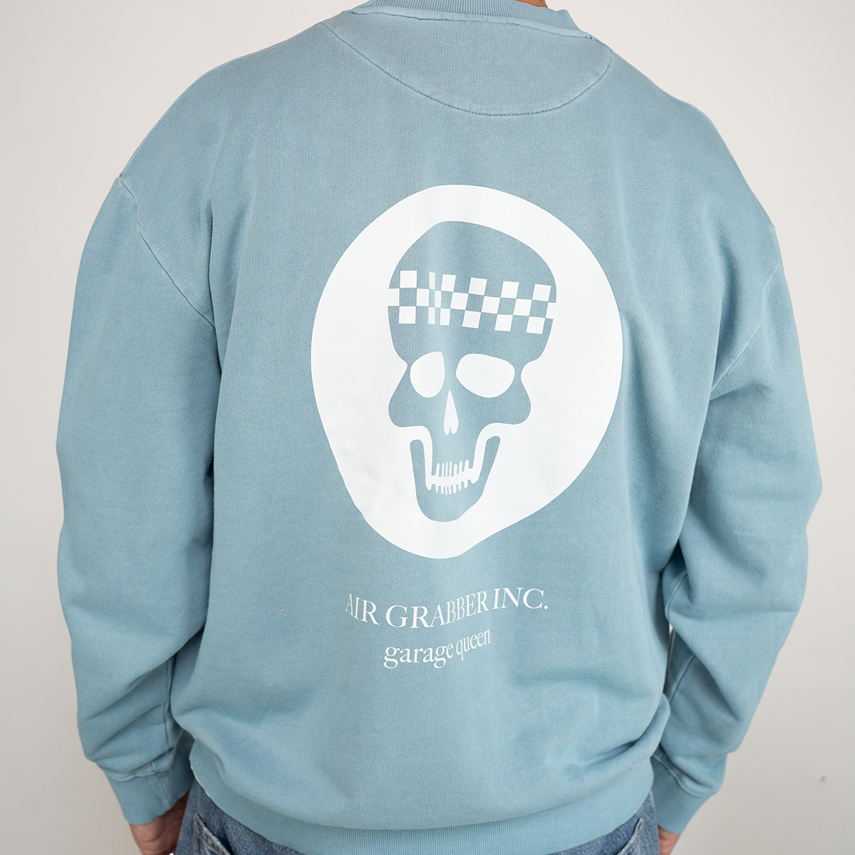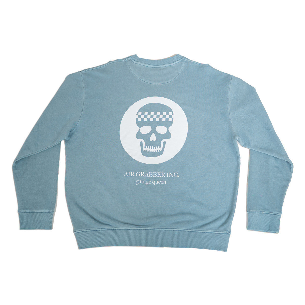 Featuring the iconic Air Grabber Inc. skull emblem with a checkerboard crown across the back, and the minimal Racing Relics Outlaw Gear logo on the chest, this piece captures the raw spirit of vintage racing with a modern sense of restraint.