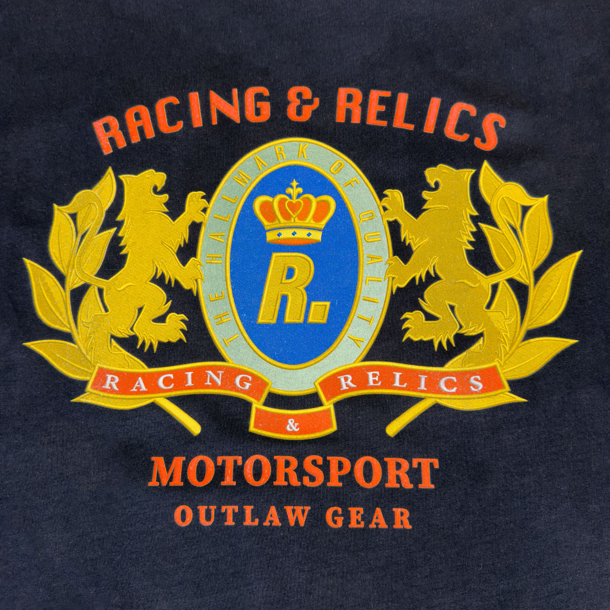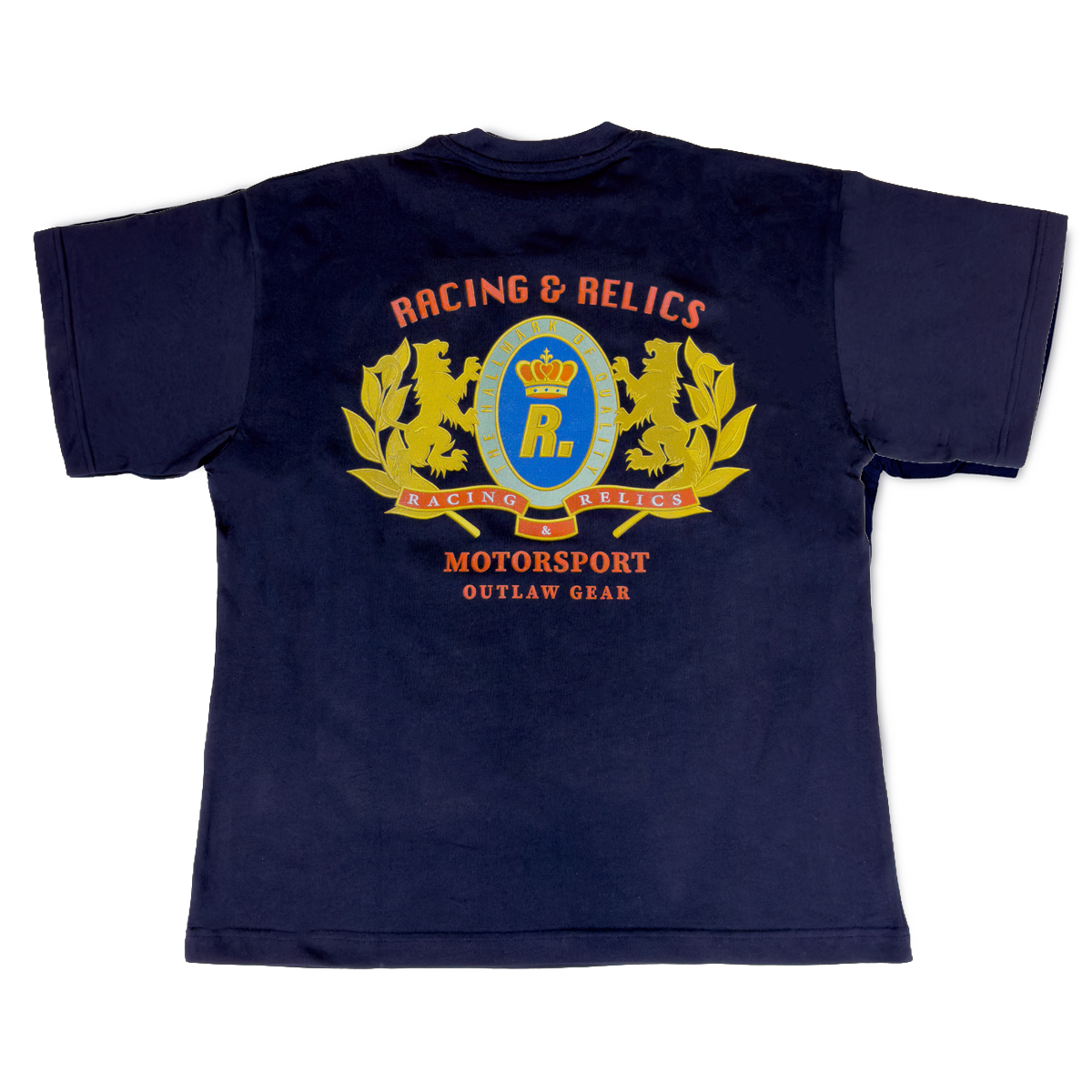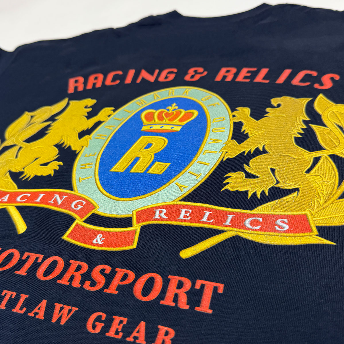 Featuring a bold, full-back print of the Racing Relics driver standing over the signature lightning arrow, this piece captures the essence of 1970s pit-lane bravado, paired with the refined craftsmanship of modern streetwear.