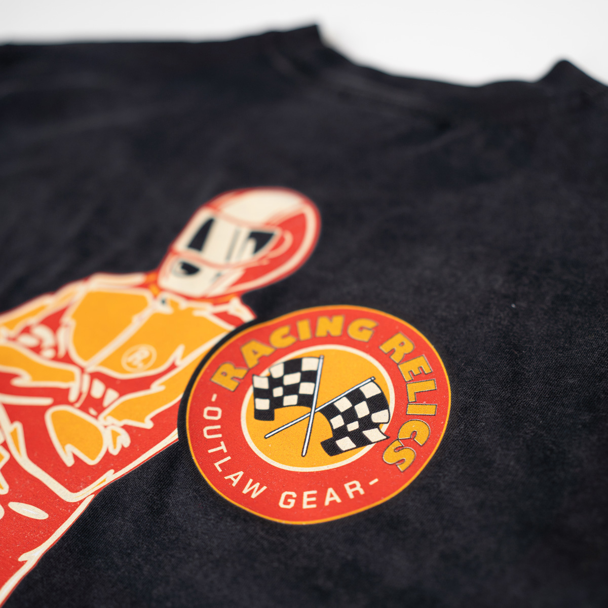 Featuring a bold, full-back print of the Racing Relics driver standing over the signature lightning arrow, this piece captures the essence of 1970s pit-lane bravado, paired with the refined craftsmanship of modern streetwear.