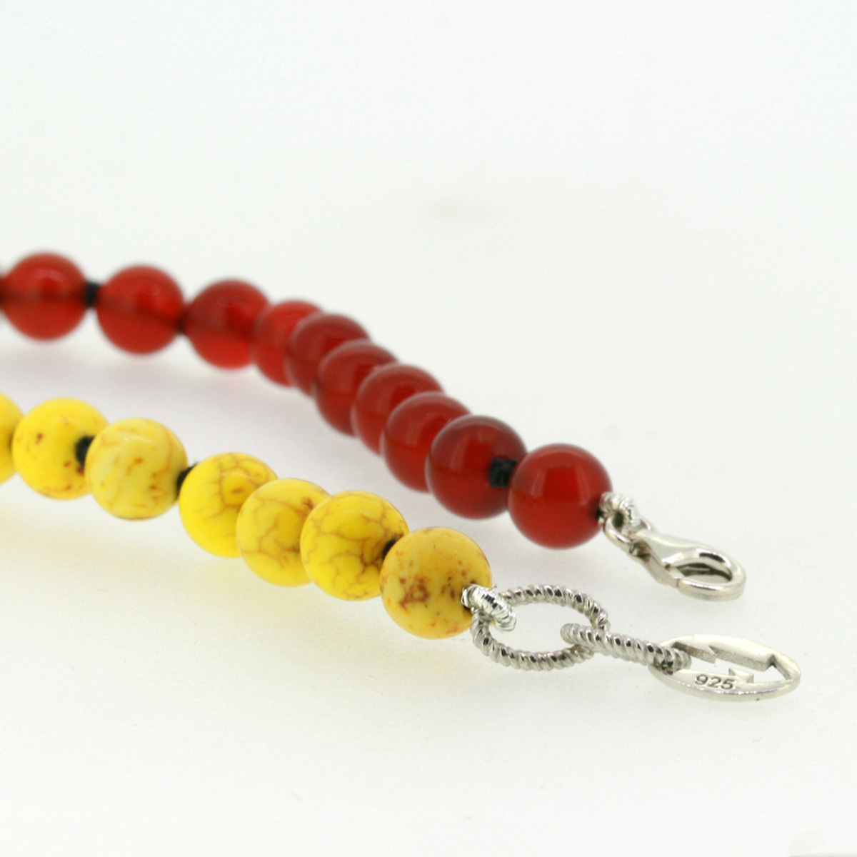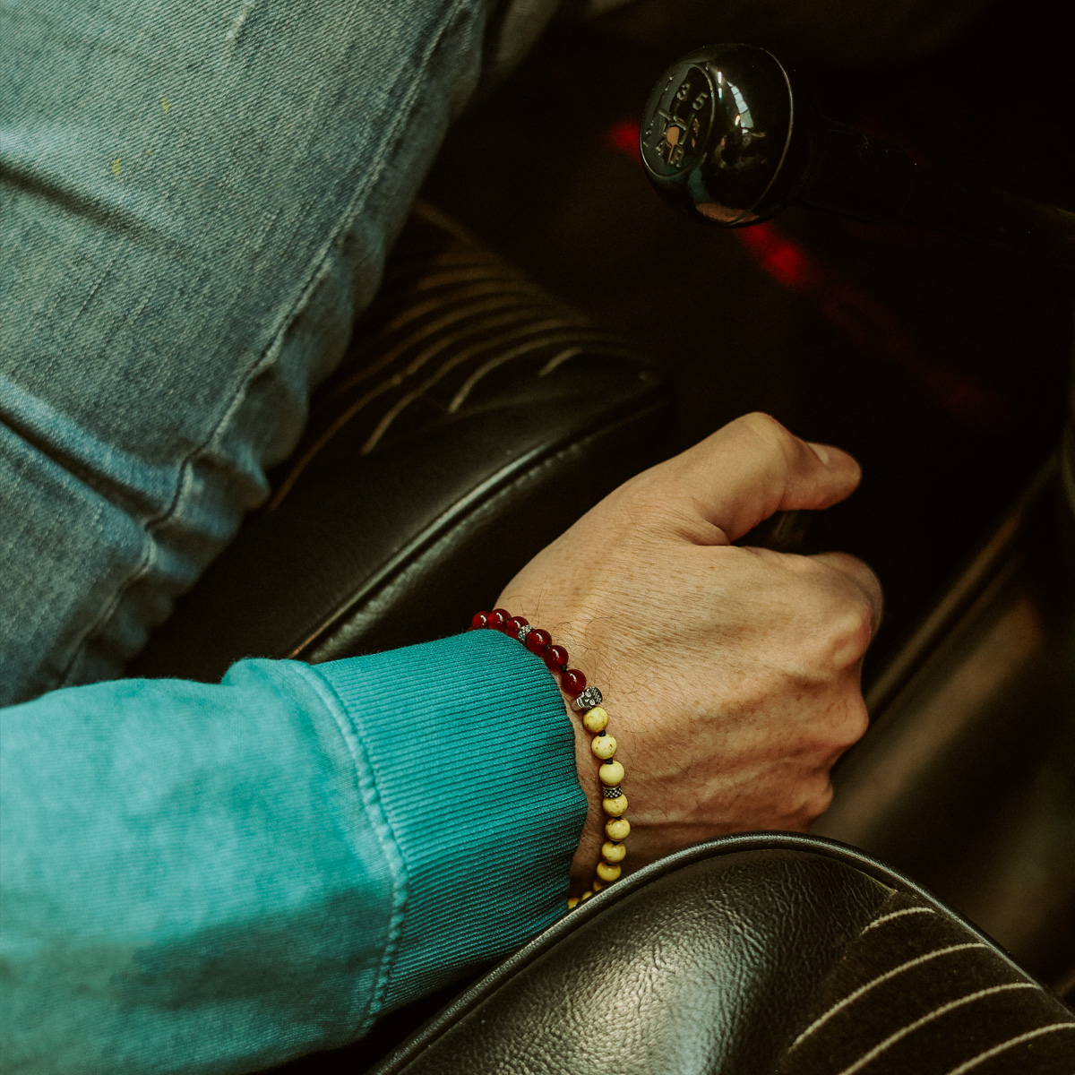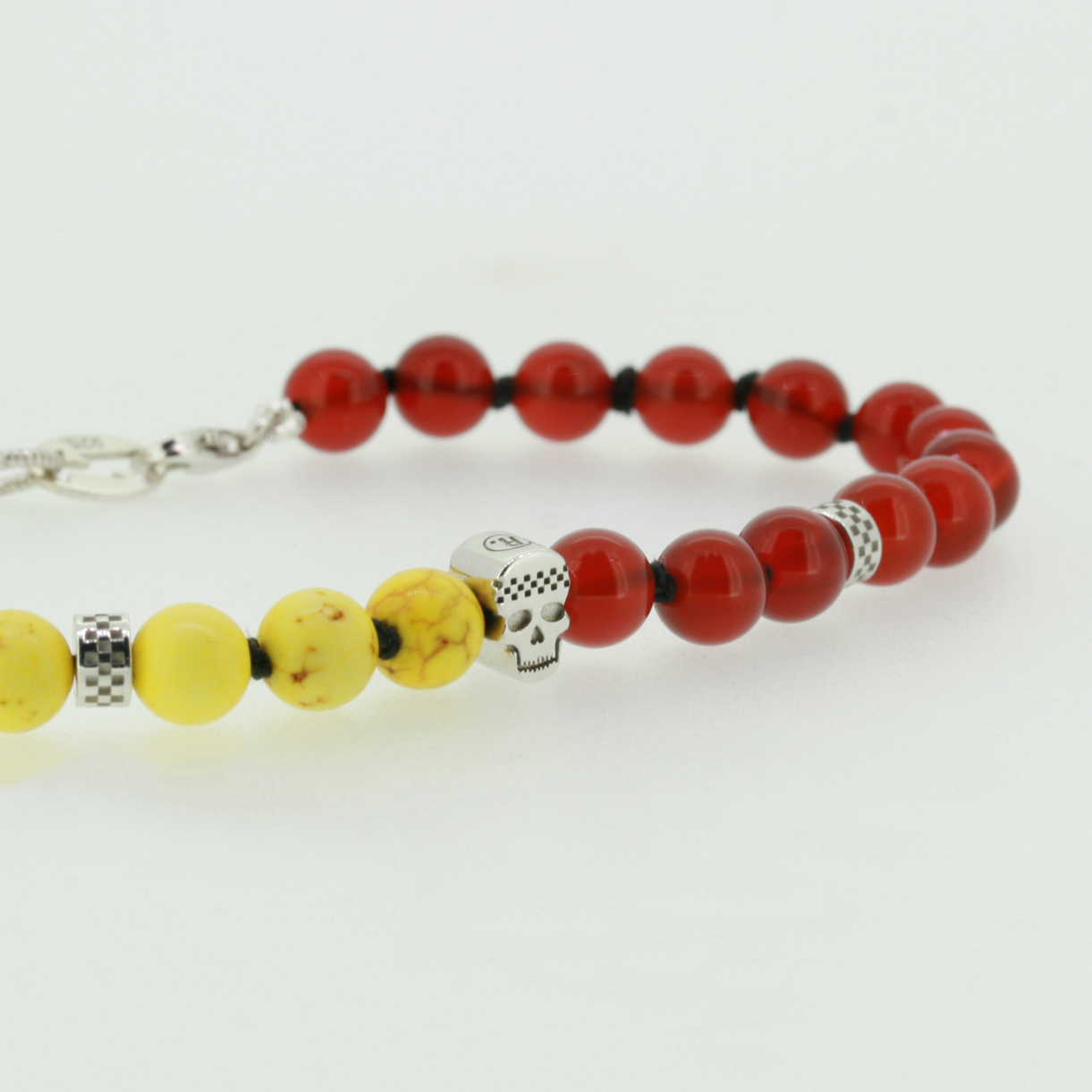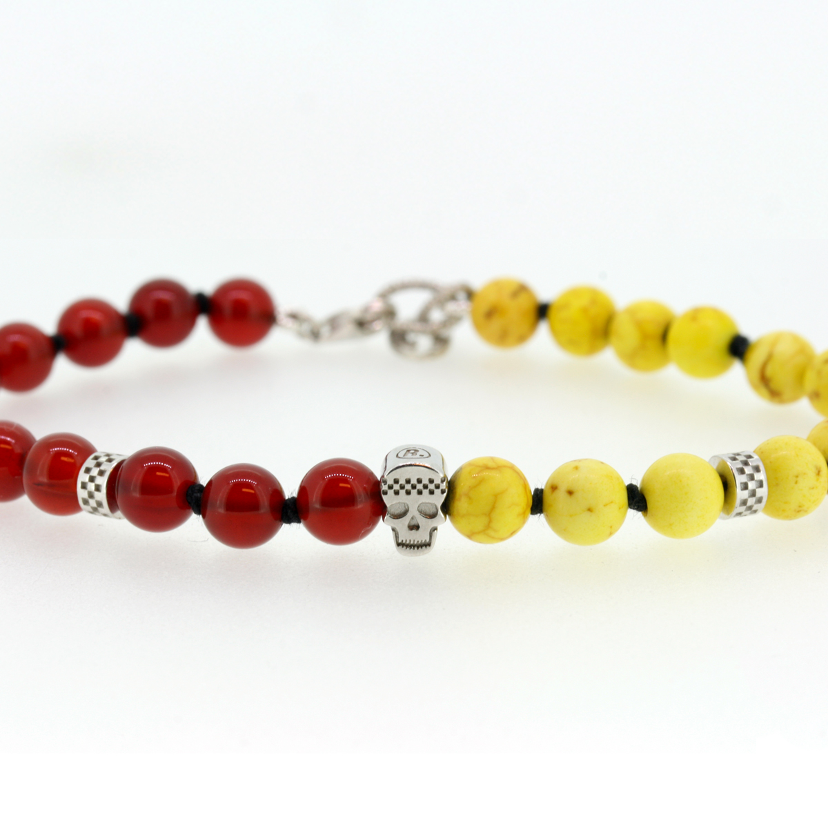 This handcrafted bracelet pairs yellow Howlite and deep red Carnelian gemstones with sterling silver details, including the brand’s signature Racingskull emblem. Each stone is hand-knotted for strength and individuality, echoing the craftsmanship of classic racing eras.